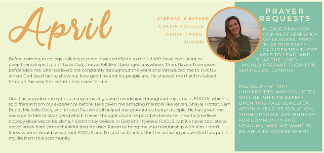 The academic year is almost over, which means that our UTD staff team has begun thinking through what our leadership team will look like next year. We rely on our students a ton to lead our cores, since they have easier access to students. This year due to COVID, the size of our community has shrunk a bit, so please be praying that God would give us wisdom and that he would guide us as we make decisions for this following year. We know that God will use students that are willing to give of their time and energy, but we also want to take chances on students that may not believe they are ready but that God might want to use in big ways. Please pray that God would equip us to train and encourage our students to be on mission for him on our UTD campus.